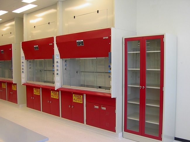 药物存放柜:用以储放液态实验试剂,如硫酸、氰化钠、过氯酸、有机化学实验试剂等挥发物药物。一般为木质,也是有钢质,可储放规格型号不一样的实验试剂。木柜规定牢固,可以并列应用,还可以与路面墙面固定不动。